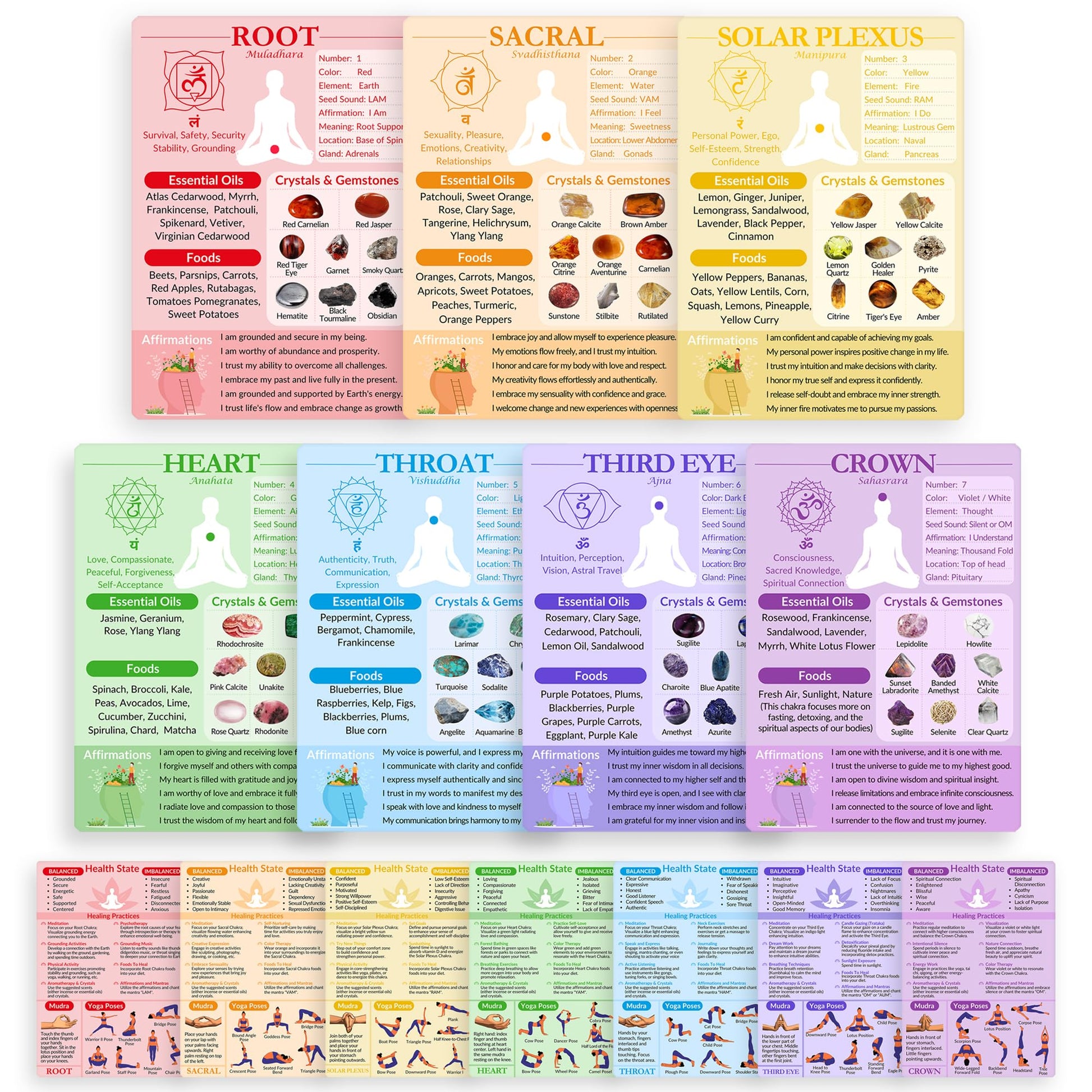 - Complete Chakra Guide: The front side includes basic information, essential oils, foods, crystals, and affirmations. The back side features health states, healing practices, mudras (hand gestures), and yoga poses. Designed for your chakra healing practice