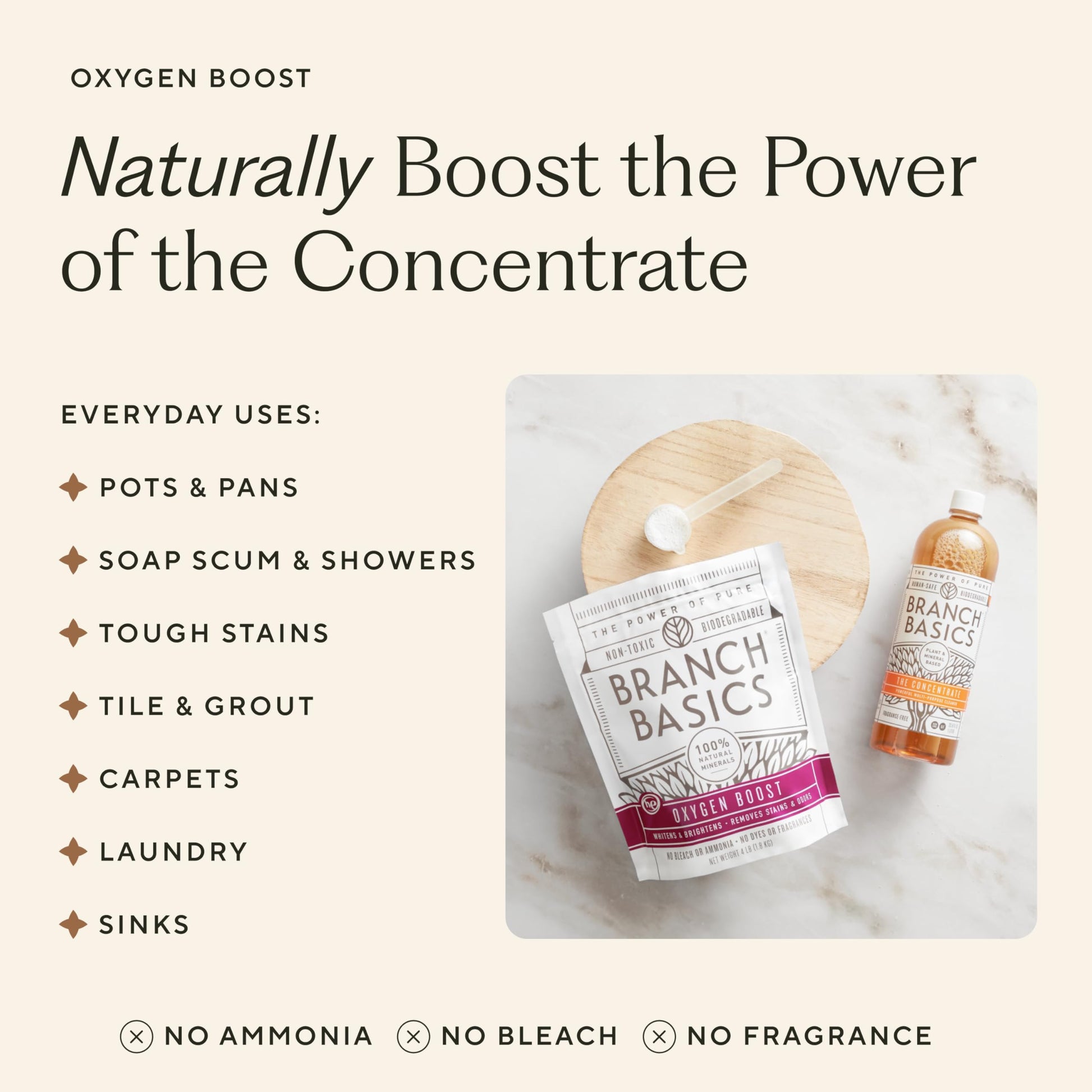 - EXTRA CLEANING BOOSTER: For tough stains, deep cleaning laundry, or hard-to-clean areas like grout and tile, our Oxygen Boost (2 lb) provides an extra boost when you need it. This powerful powder, made from natural ingredients like baking soda, works in tandem with the Concentrate. Use it for deep cleaning, scrubbing or as a stain remover. Includes one reusable scoop.