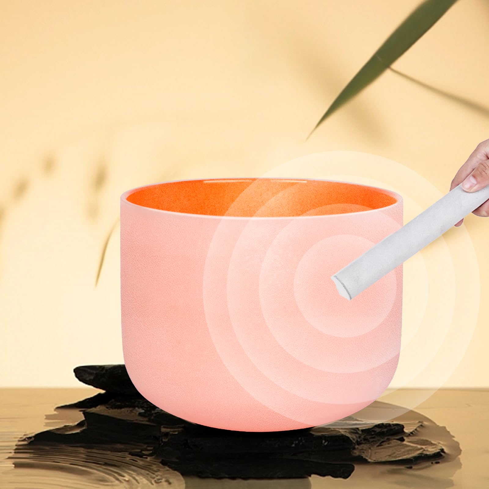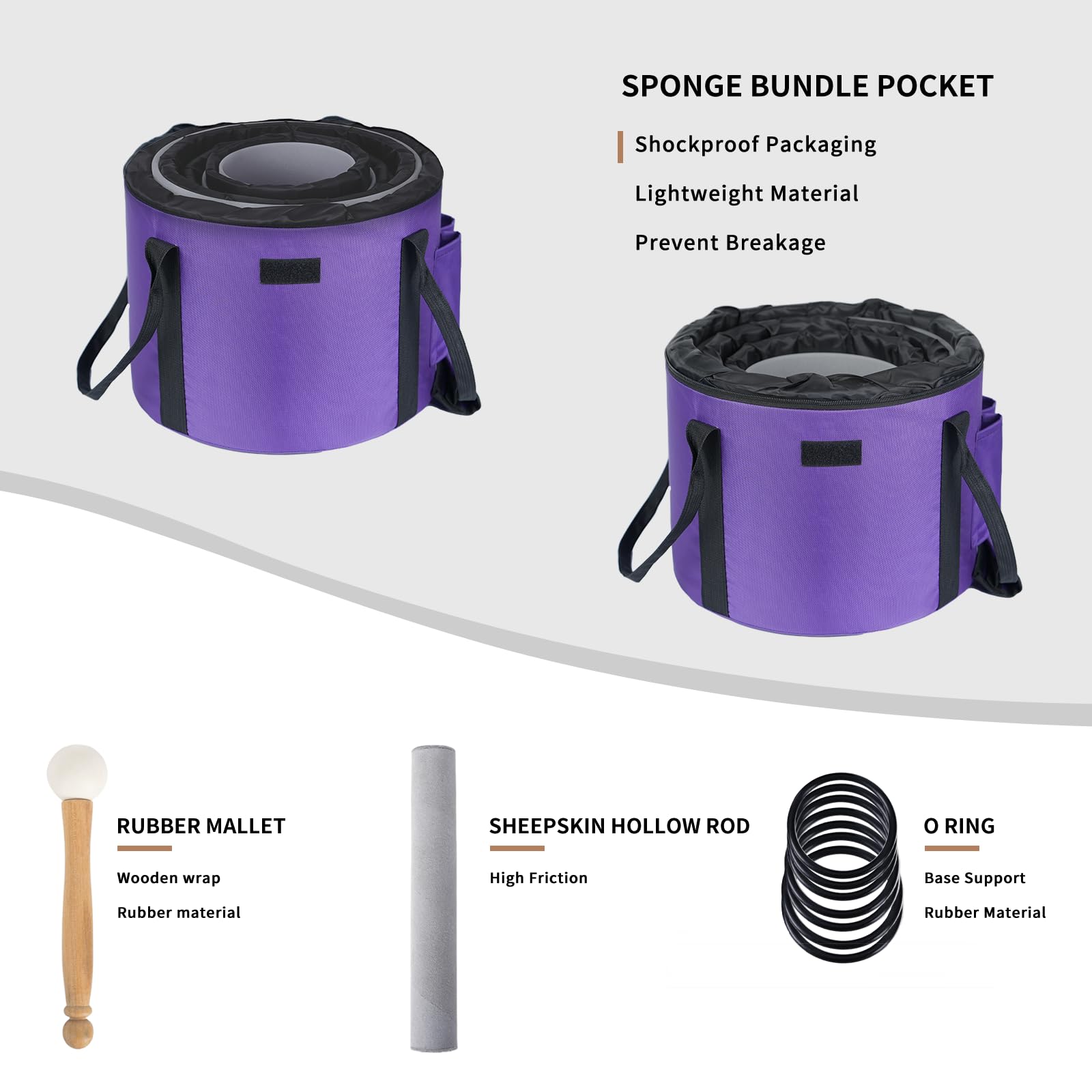 - Package includes: crystal singing bowl set (1* 6” wide Violet 432hz B Note, 1* 7” wide Indigo 432hz A Note, 1* 8” wide Blue 432hz G Note,1* 9” wide Green 432hz F Note, 1* 10” wide Yellow 432hz E Note, 1* 11” wide Orange 432hz D Note, 1* 12” wide Red 432hz C Note), 1* thick cowhide suede striker, 1* rubber mallet, 7* one O-ring, 2* carrying bags