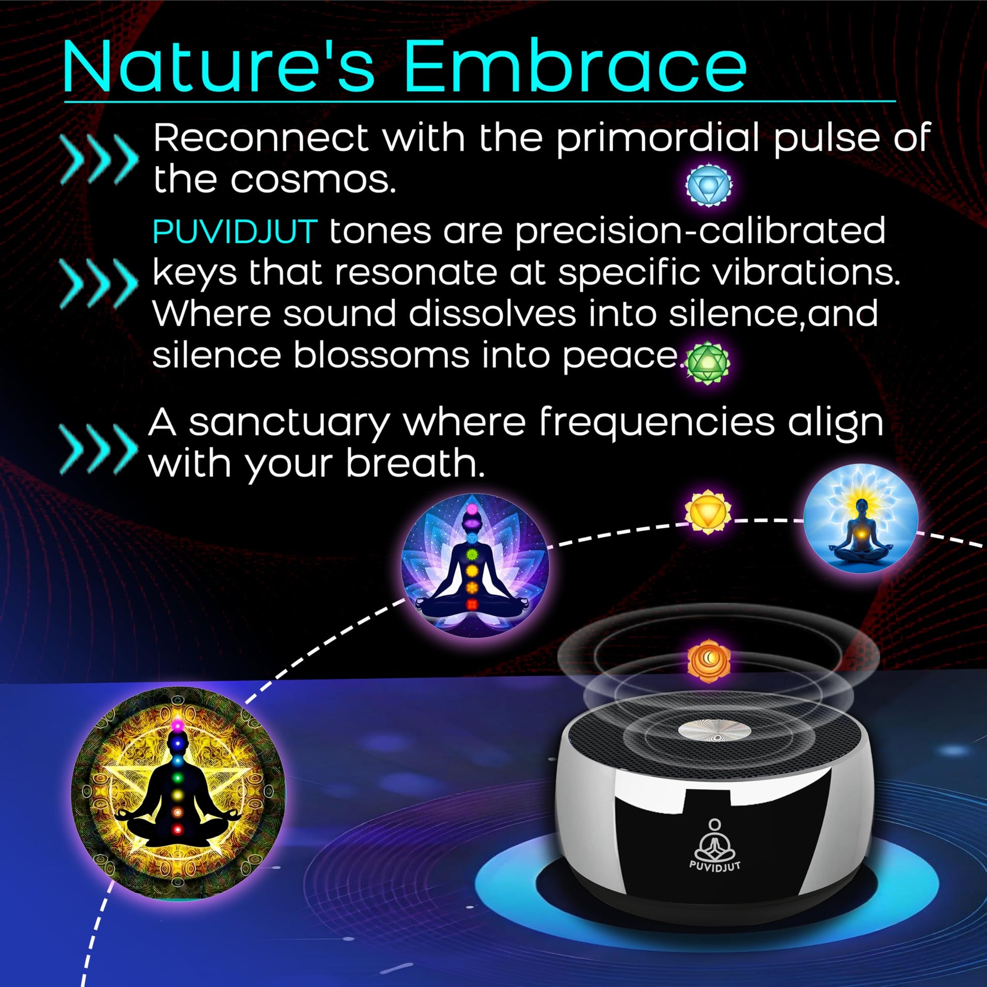 - Sound Frequency System: PUVIDJUT has its own relaxing and smooth sound system, no need for a mobile phone or network. Take PUVIDJUT meditation machine, and enjoy the sound bath, you’ll reduce anxiety, remember peace, and renew from the tone wave. With our tones, start your inner spiritual journey.