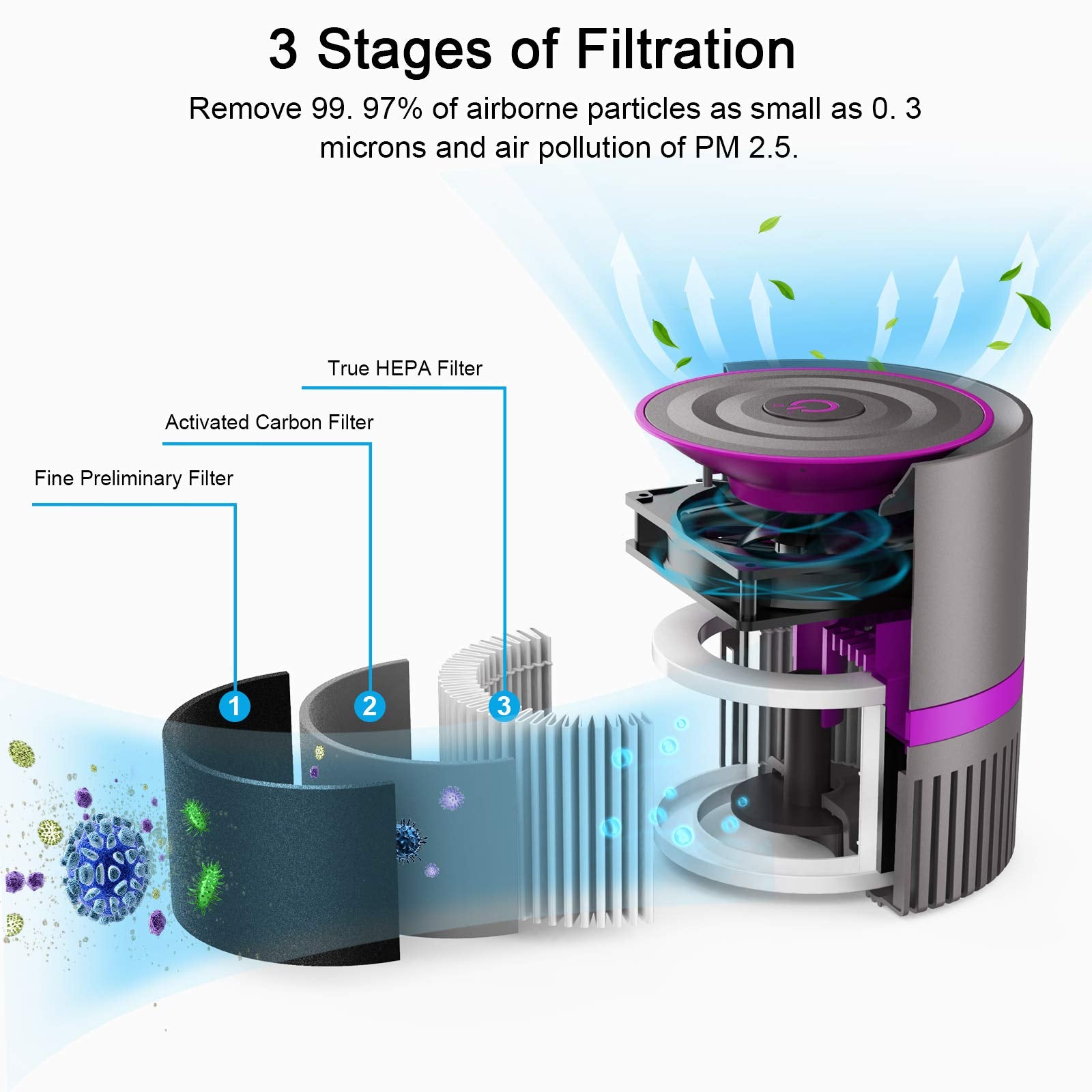 - Clean Air All Around - Megawise HEPA Air Purifier features a three-stage filtration system. This comprises a pre-filter, a HEPA filter, and an activated carbon filter, powerful enough to captures up Smoke, Dust, Pet Dander, filters small particles and air pollution of PM 2.5. Perfect for pet lovers, babies, children, the elderly, or anyone wanting to improve the air quality.