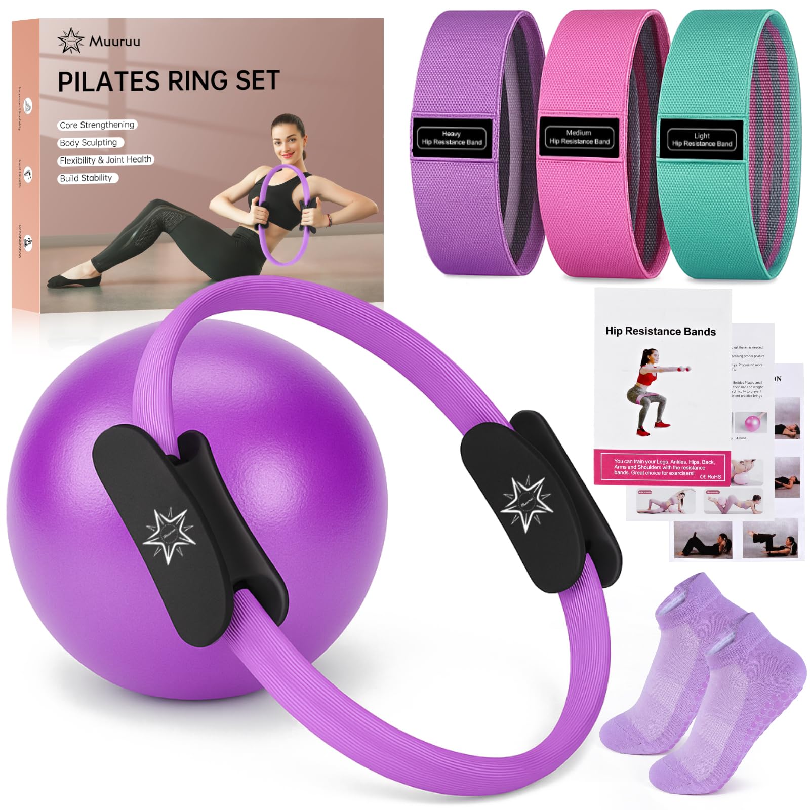 Muuruu Pilates Essentials Kit for Home Women, Ring and Ball Set, Pilates Equipment for Workouts, 3 Resistance Bands, Grip Socks, 14 Inch Magic Circle, Mini Exercise Ball, Great Exercise Equipment