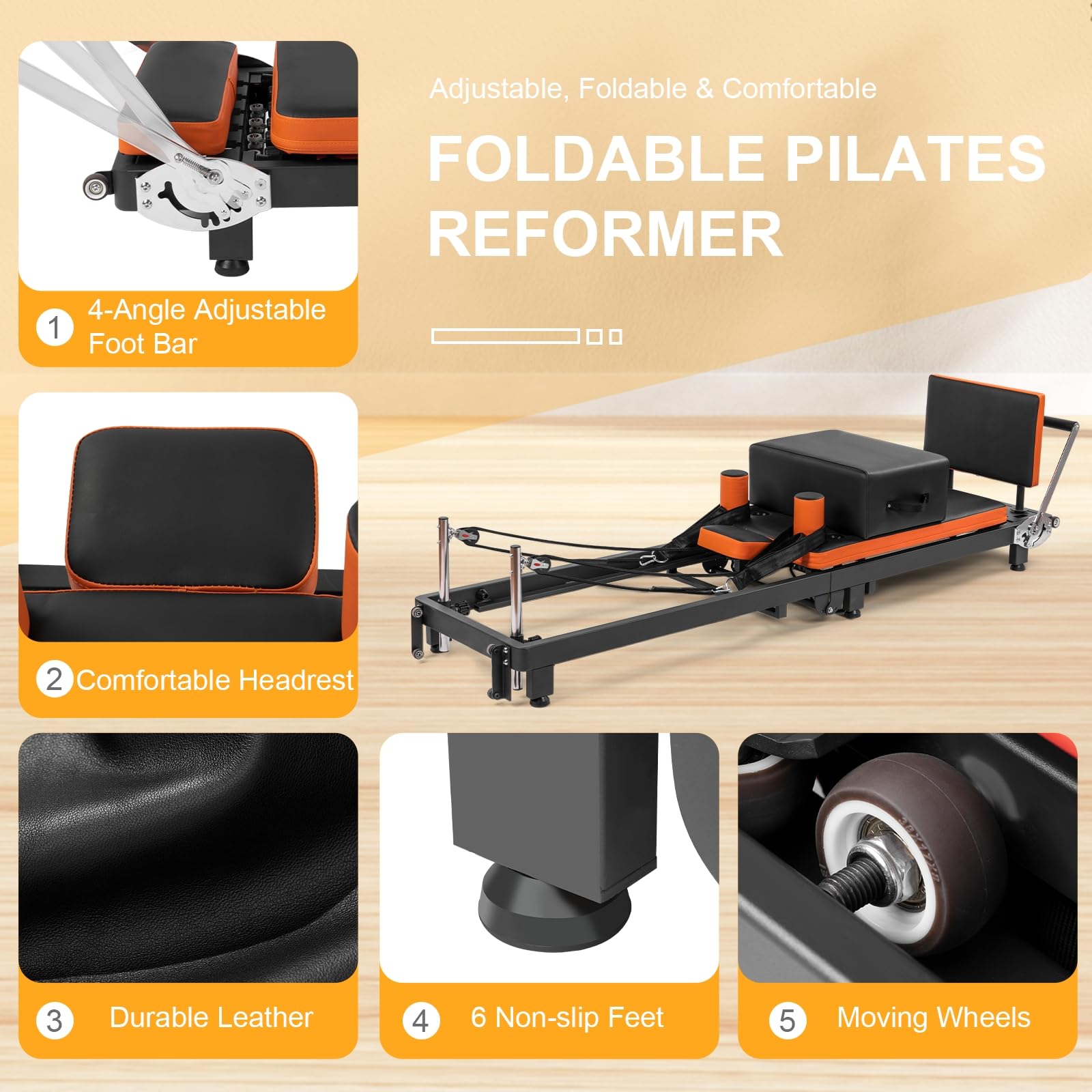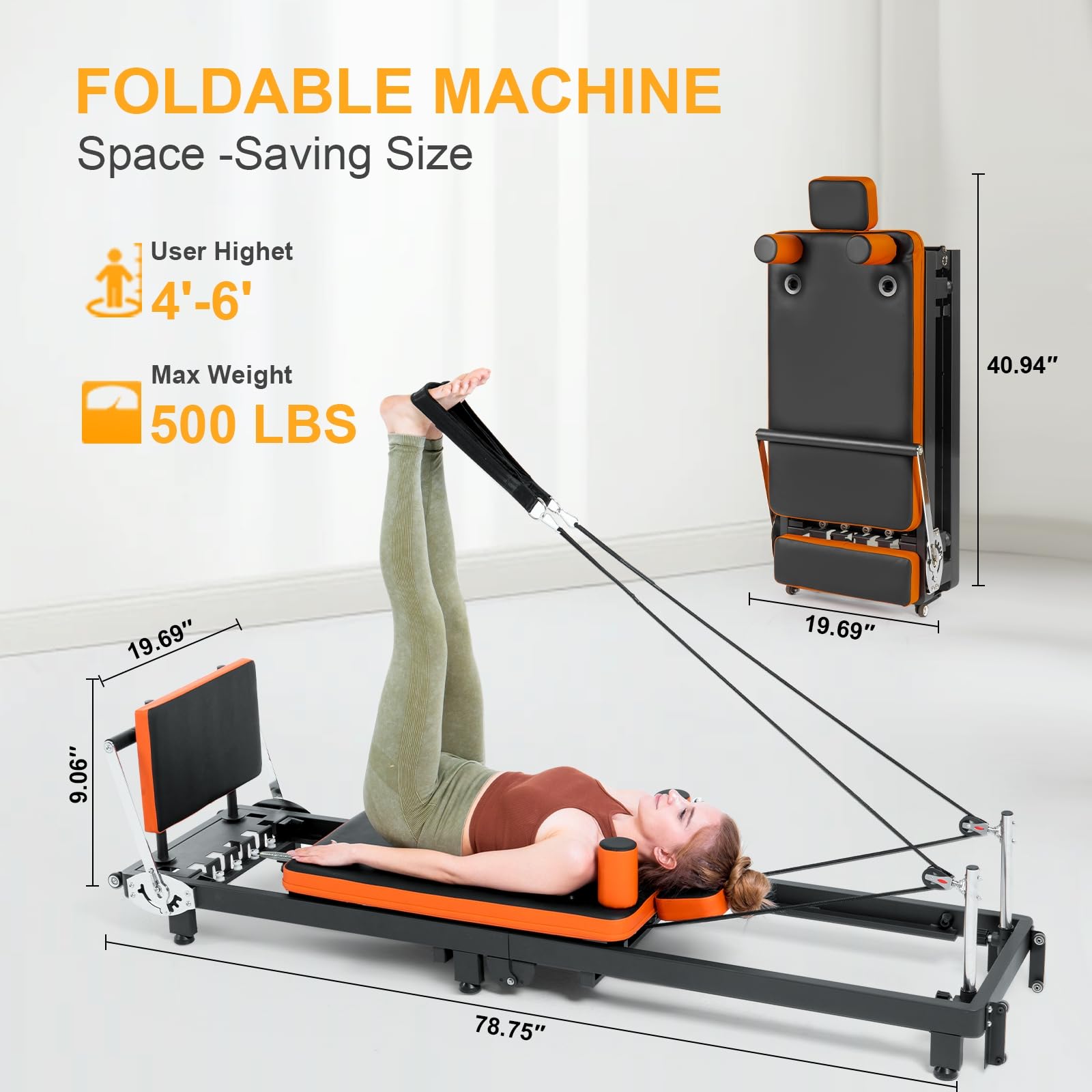 - Versatile Pilates Reformer: Our upgraded Foldable Pilates Reformer (with Pilates Box & Jumpboard) is designed for both beginners & advanced users. You can customize your own Pilates workout plan and enjoy training for your arms, legs and core muscles at home or in the studio. (Note: Recommended for Pilates enthusiasts heights between 4' to 6'.) Just enjoy Pilates workout now!