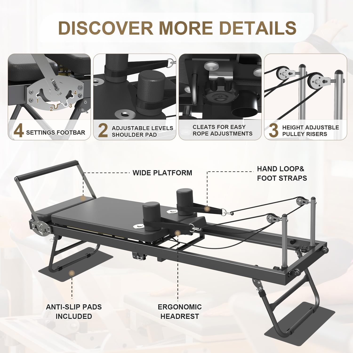 - 💪Pilates Reformer for Tall Users: Suitable for up to 6'1'' and supports up to 450 lbs, ensuring comfort and stability for a wide range of body types
