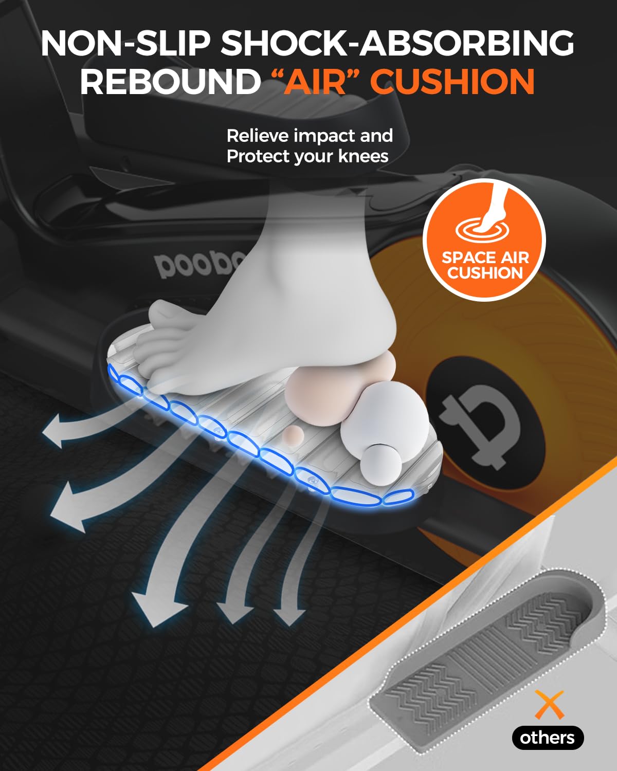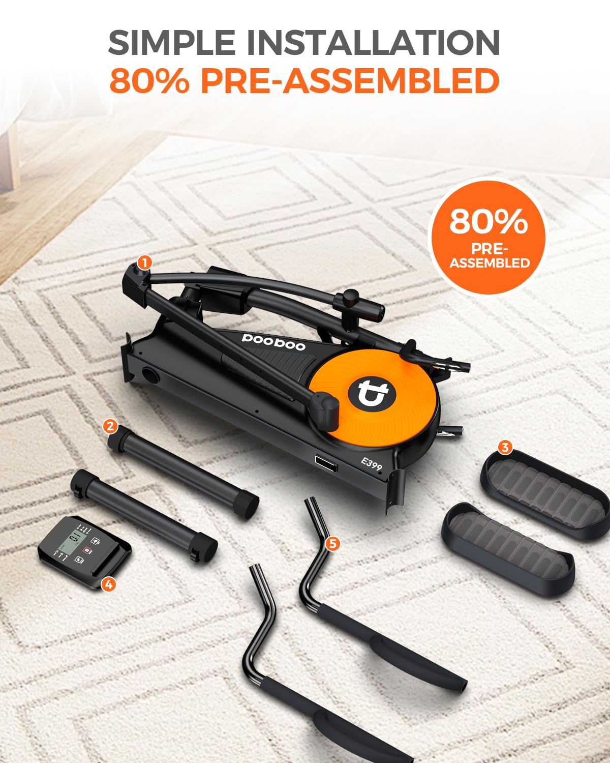 - Warm Tips: The pooboo elliptical machine designed 80% pre-assembled. Say goodbye to the traditional complicated setup process. Guided by the manual or assembly video, you can easily finish it within 30 minutes. Besides, when not in use, it can be quickly and easily folded up