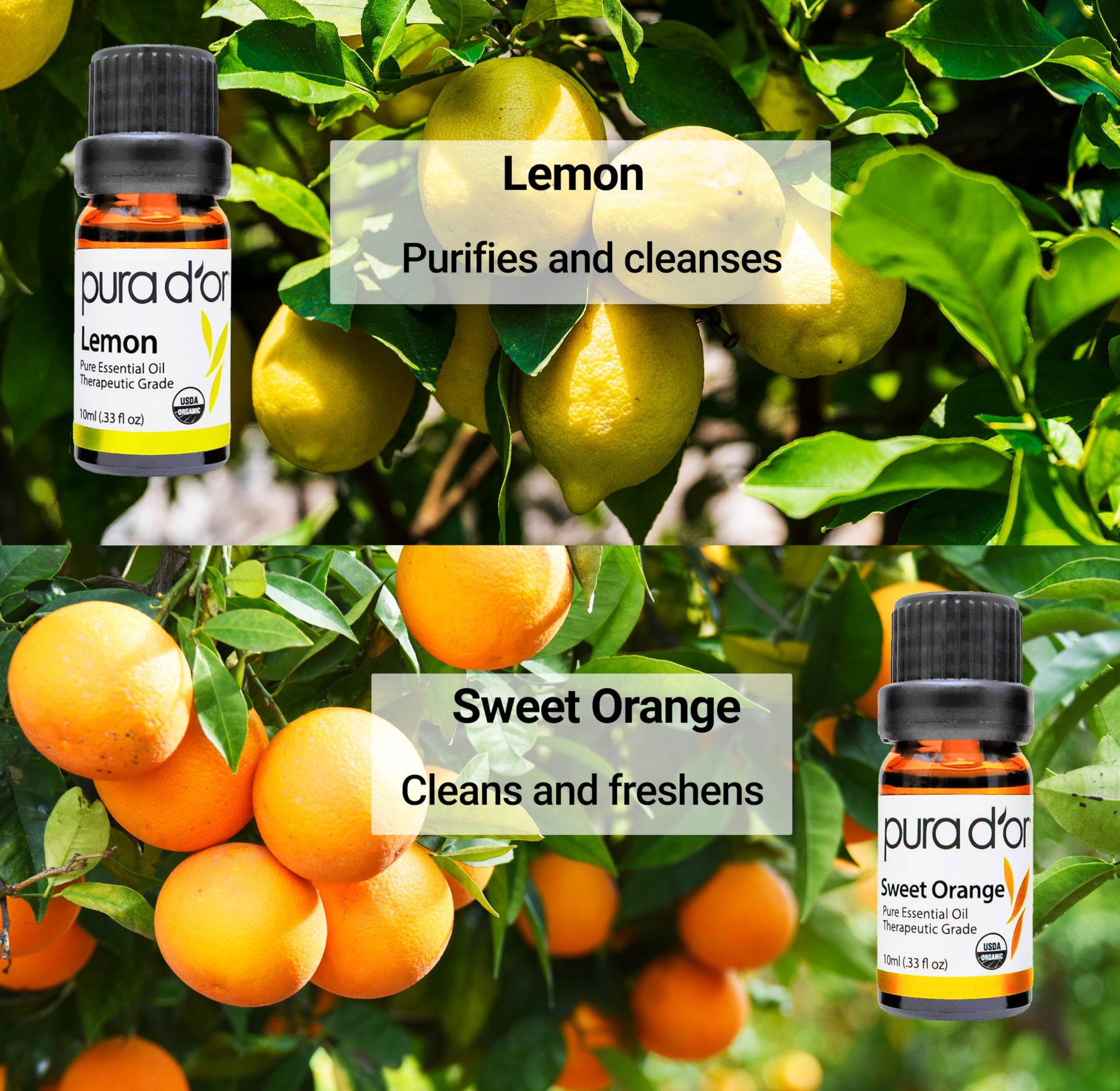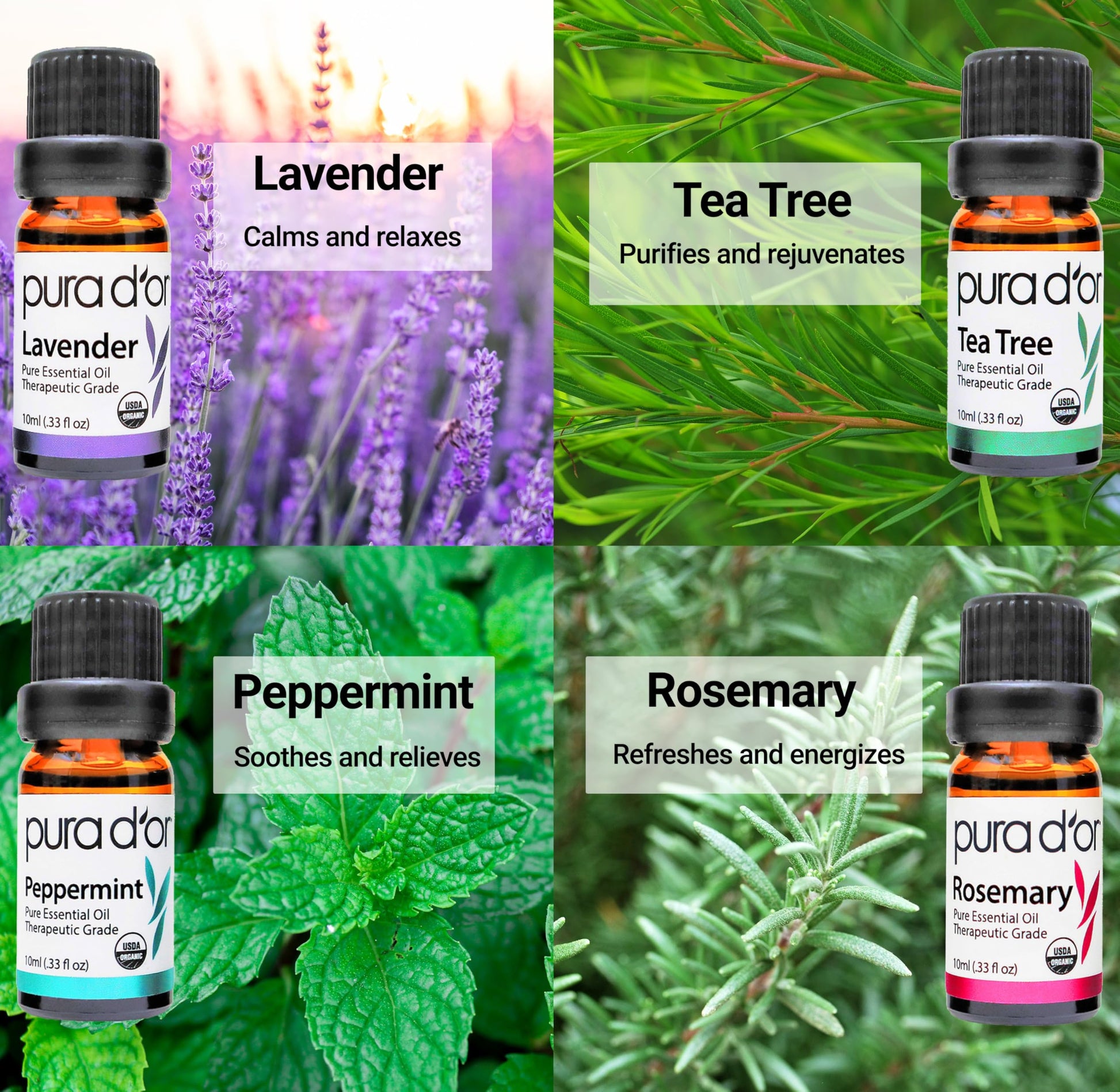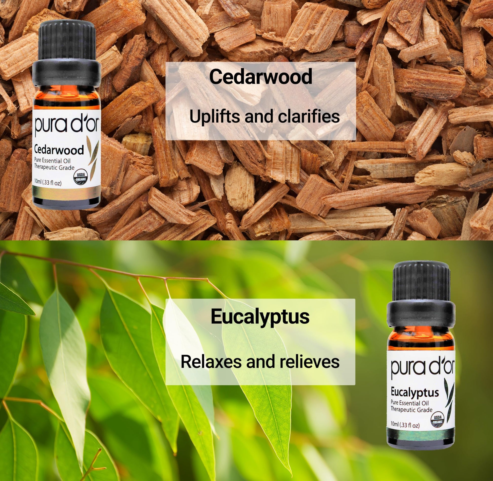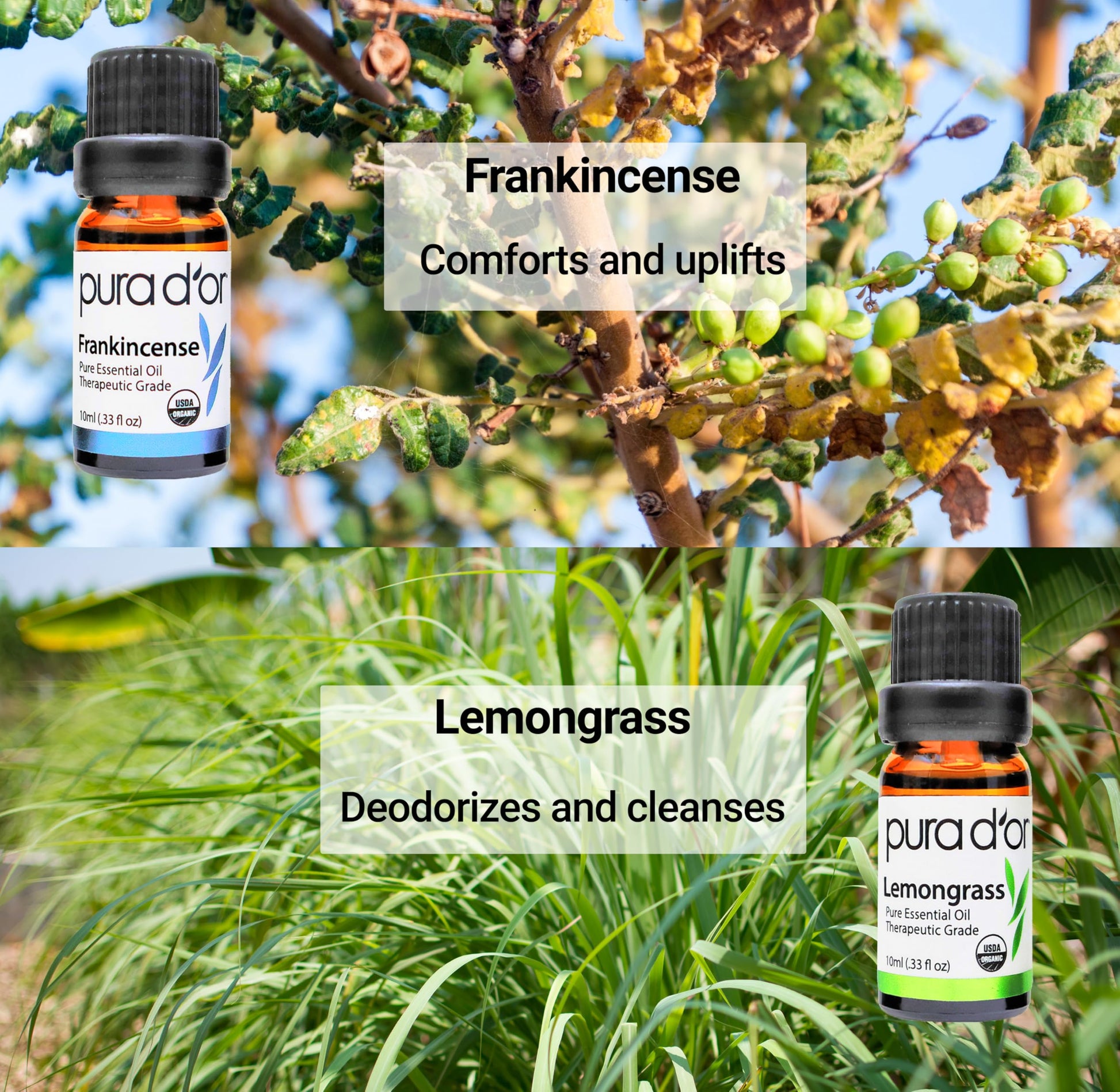 Details: Sense of smell is the oldest and strongest sense in the body. It can help us detect harm from far away, or in most cases, it helps us find peace and balance between our body and mind. PURA D’OR Perfect 10 Essential Oil Set is made of 100% pure and natural USDA certified organic therapeutic grade quality aromatherapy oils. Our fragrance oils offer a variety of uses from aromatherapy to improving overall wellness, massage therapy or even to just initiate a sense of peacefulness and relaxation. Essential oils are extracted from root, seed, flower, leaf, or bark of a tree or plant. Because it is pure and natural, it holds powerful and incredibly beneficial compounds. Any oil from our essential oil set can be diffused or topically applied (only when diluted) to experience its unique properties or even just to feel connected with nature. This set of aromatherapy oils comes with Lavender Essential Oil, Pure Peppermint Oil, Tea Tree Oil, Lemon Oil, Sweet Orange Oil, Rosemary Oil, Lemongrass Oil, Frankincense Essential Oil, Eucalyptus Oil, and Cedarwood Oil. Because essential oils are highly potent, direct application without dilution can cause dryness or irritation on the skin so it is important to always dilute your favorite essential oil with any carrier oils of your choice to make it safe for topical application. PURA D’OR products are free from harsh ingredients and cruelty free. Our products are manufactured in a facility in Southern California where we use renewable energy sources.