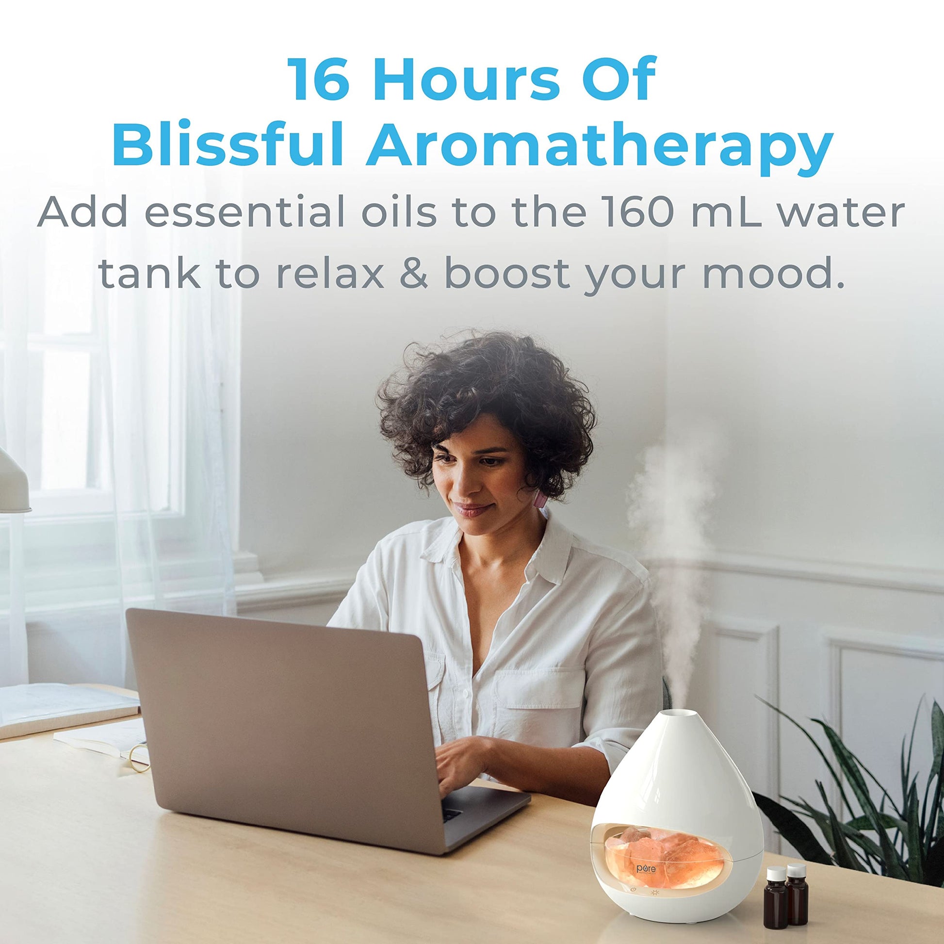- Relaxing Aromatherapy: From soothing aromatic benefits to increased energy levels and mood, the essential oil diffuser is ideal for yoga, meditation, relaxing, reading, studying, or working. Simply fill the 160 mL water tank and add your favorite essential oils to moisturize and refresh your space for up to 16 hours.