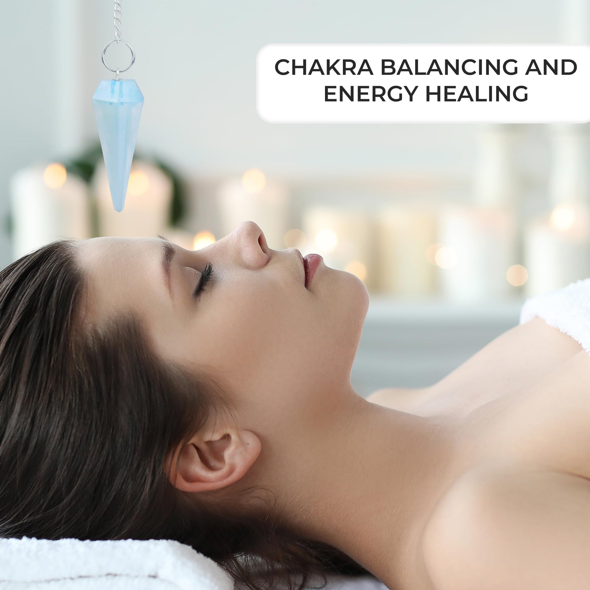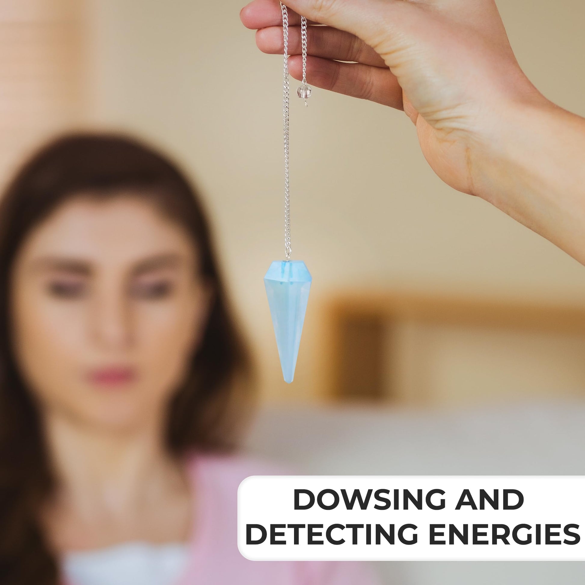 - CHAKRA DOWSING PENDULUM: This reiki pendulum with the natural blue opalite crystal is a stone of compassion, success and inspiration. Opalite is often associated with the third eye chakra. It is said that opalite helps improves communication on all levels, especially the spiritual. It removes energy blockages of the chakras and meridian. Opalite is subtle yet highly energetic