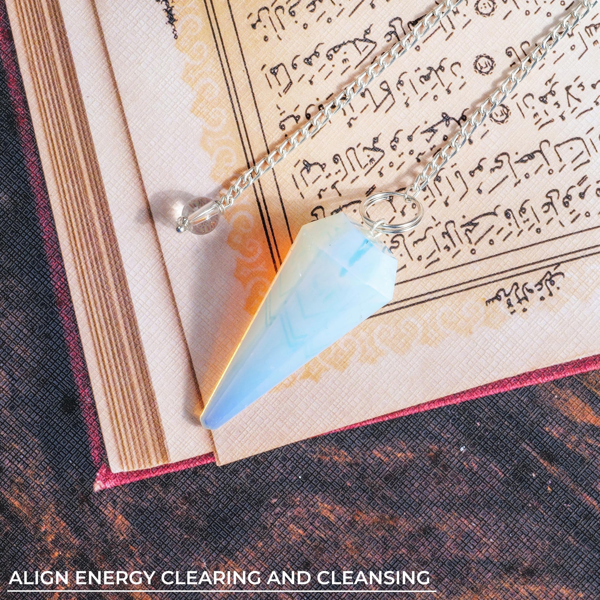 - OPALITE CRYSTAL POINT PENDULUM: This beautifully handmade opalite chakra stones pendulum necklace comes with a silver chain, the pendulum is approximately 1.5 inches in size and weighs around 50 grams. The stone in the crystal pendulum is a natural opalite crystal from India. We only use natural and raw stones so that they are effective in healing and giving you the best results for their purpose.