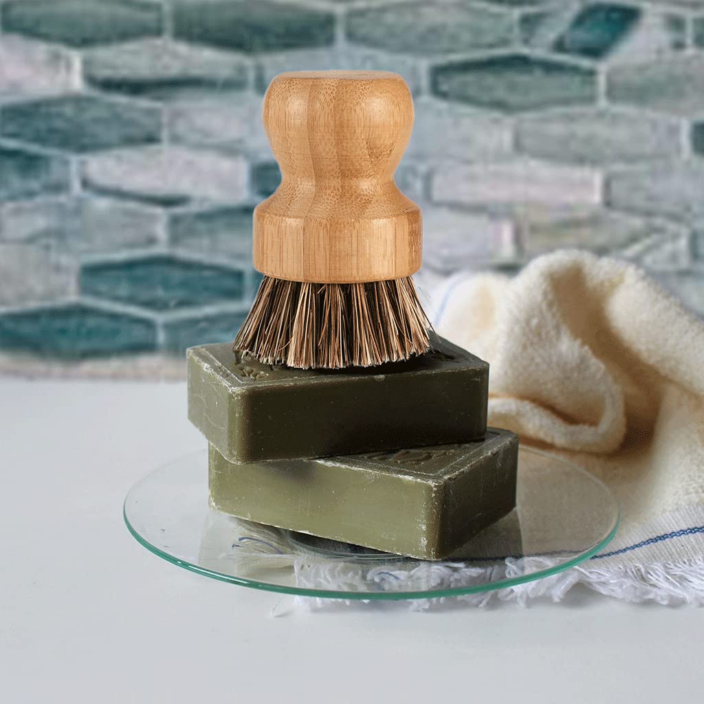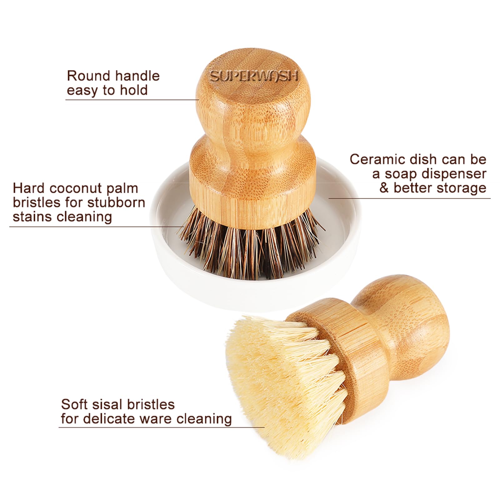 SUPERWASH PLUS Bamboo Brush Dish Scrubber Clean Pan and Vegetable, Natural Bristles Palm Pot Brush 2 Pack Round Mini Dish Brush with 2 Ceramic Dish for Kitchen Sink Cleaning