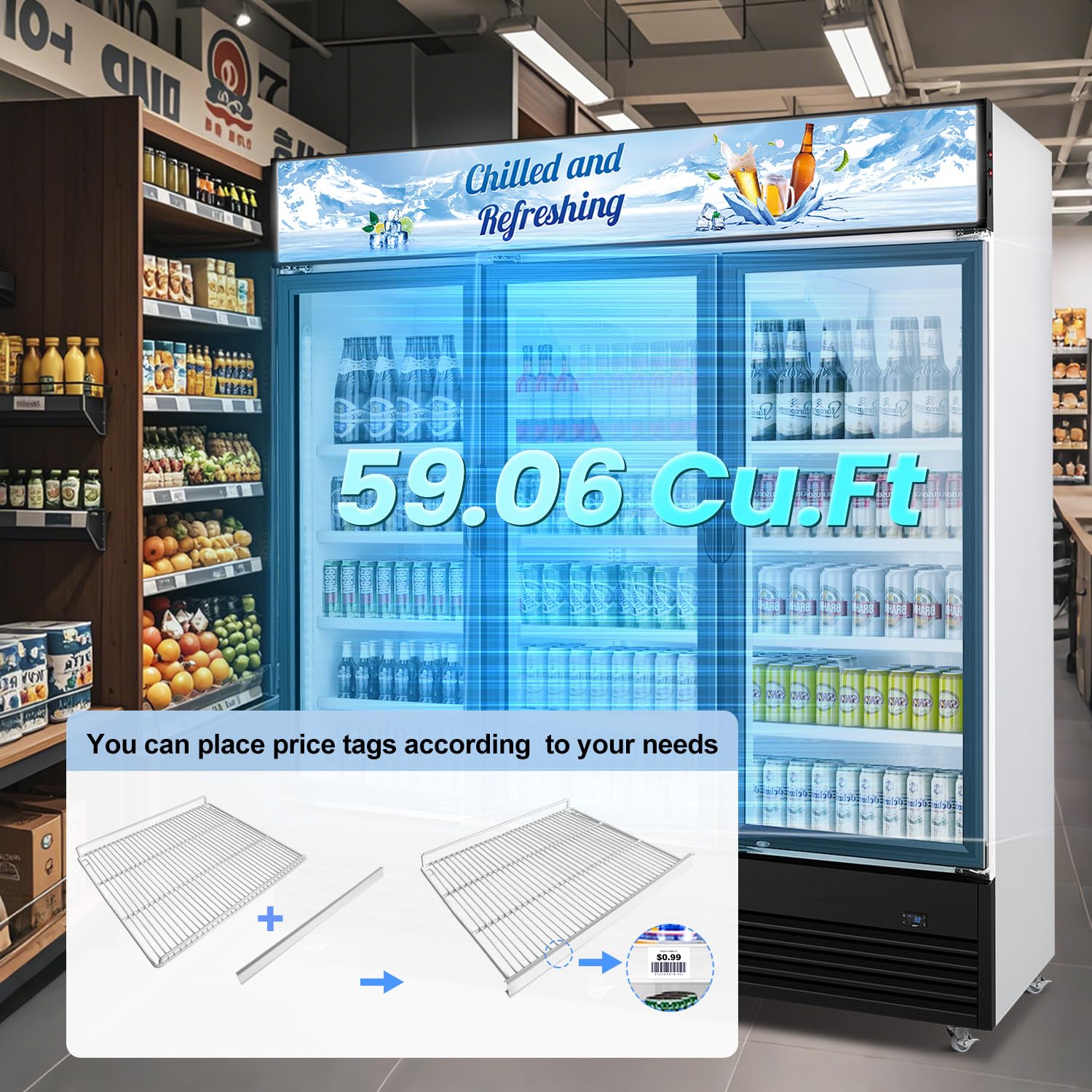 Tylza Commercial Refrigerator, Three Glass Door Display Beverage Fridge, 59.06 Cu Ft Upright Beverage Cooler Merchandiser with Replaceable Advertising Light Board, Rebound Door, Fast Cooling